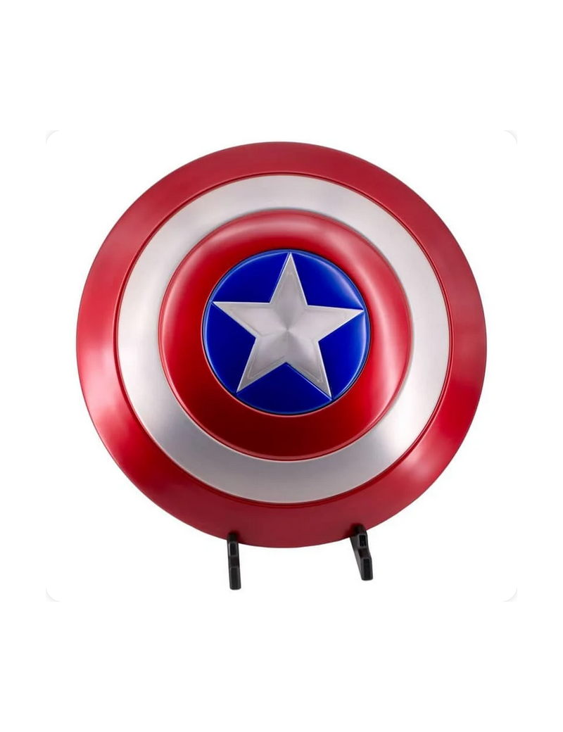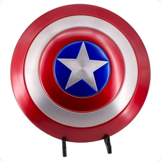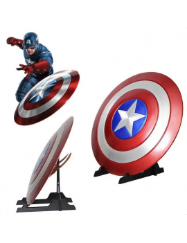 Réplique non officielle du bouclier Captain America en alliage d’aluminium livrée avec son support bois de présentation. Sangles de maintien en cuir marron. Diamètre 60cm, poids 3.2kg.