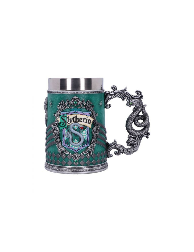Serpentard est l'une des 4 maisons de Poudlard, l'école des sorciers. L'emblème est un serpent qui est représenté des deux cotés de la chope ainsi que les couleurs de la maison, le vert et l'argent