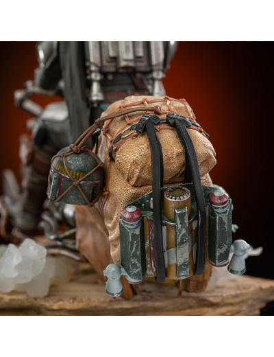 Figurine de Din Djarin aka The Mandalorian & Grogu par Iron Studios. Provenant de l'univers de Star Wars - The Mandalorian, Din Djarin fonce à travers le désert sur son speederbike avec Grogu et une armure Mandalorienne fraichement récupérée.