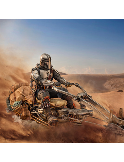 Din Djarin & Grogu on Speederbike -...Figurine de Din Djarin aka The Mandalorian & Grogu par Iron Studios. Provenant de l'univers de Star Wars - The Mandalorian, Din Djarin fonce à travers le désert...