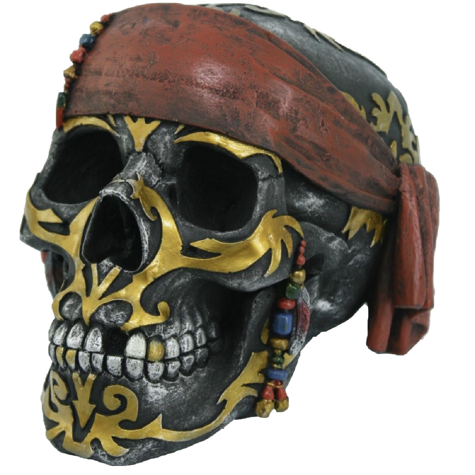Crâne habillé de son bandeau de pirate fabriqué en résine.