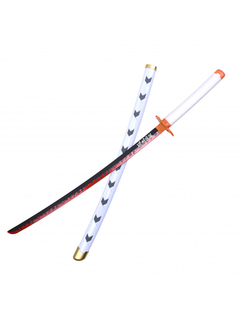 Réplique de l'épée de Kyojuro Rengoku du Manga animé Demon Slayer. La lame est en bambou noir et rouge et le fourreau est en bois blanc décoré. La garde (Tsuba) est en forme de flamme, la poignée (Tsuka) est en simili cuir blanc.
